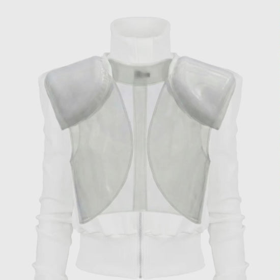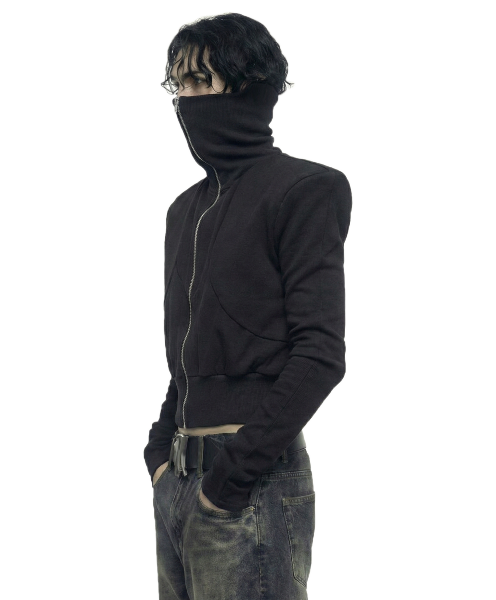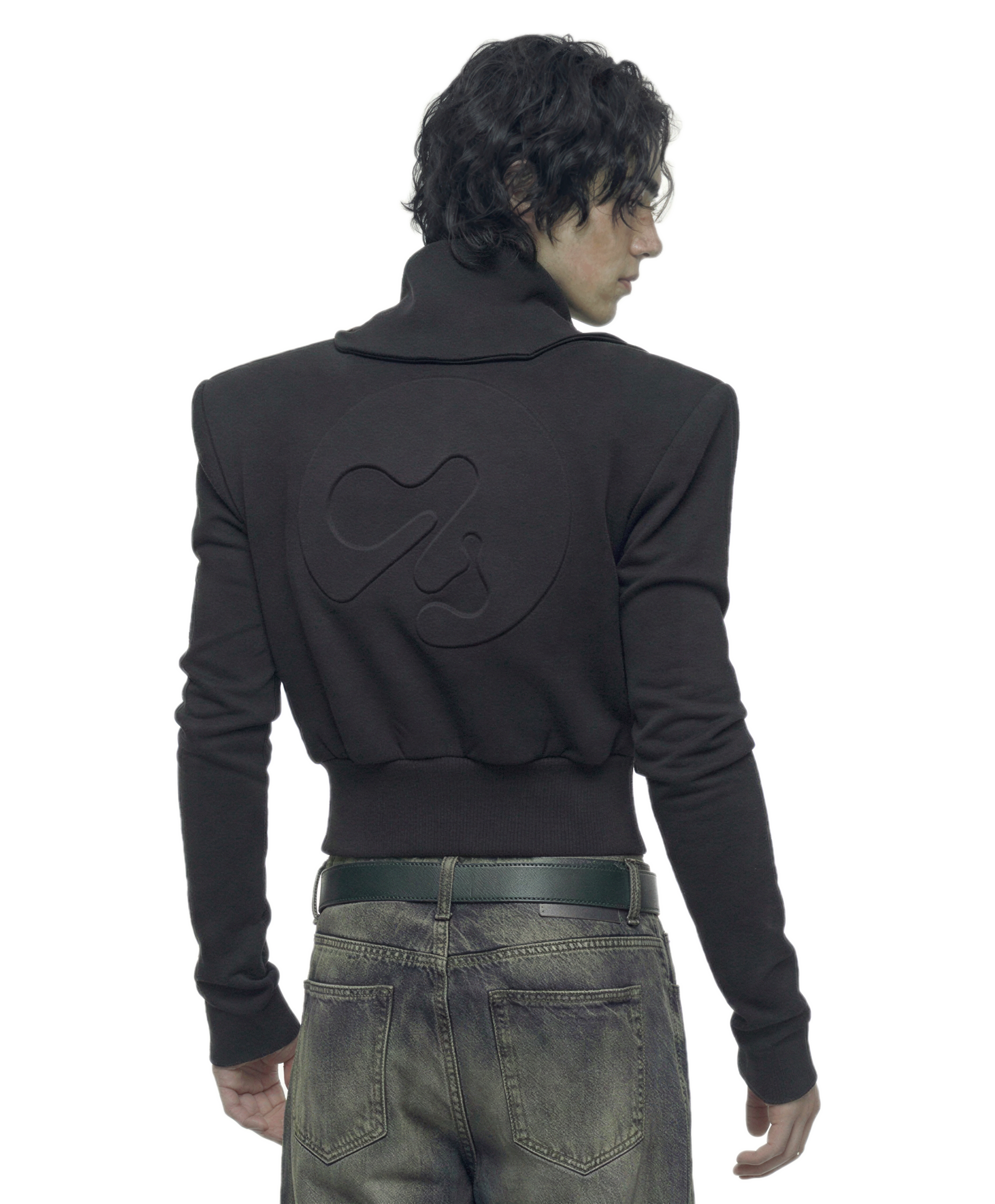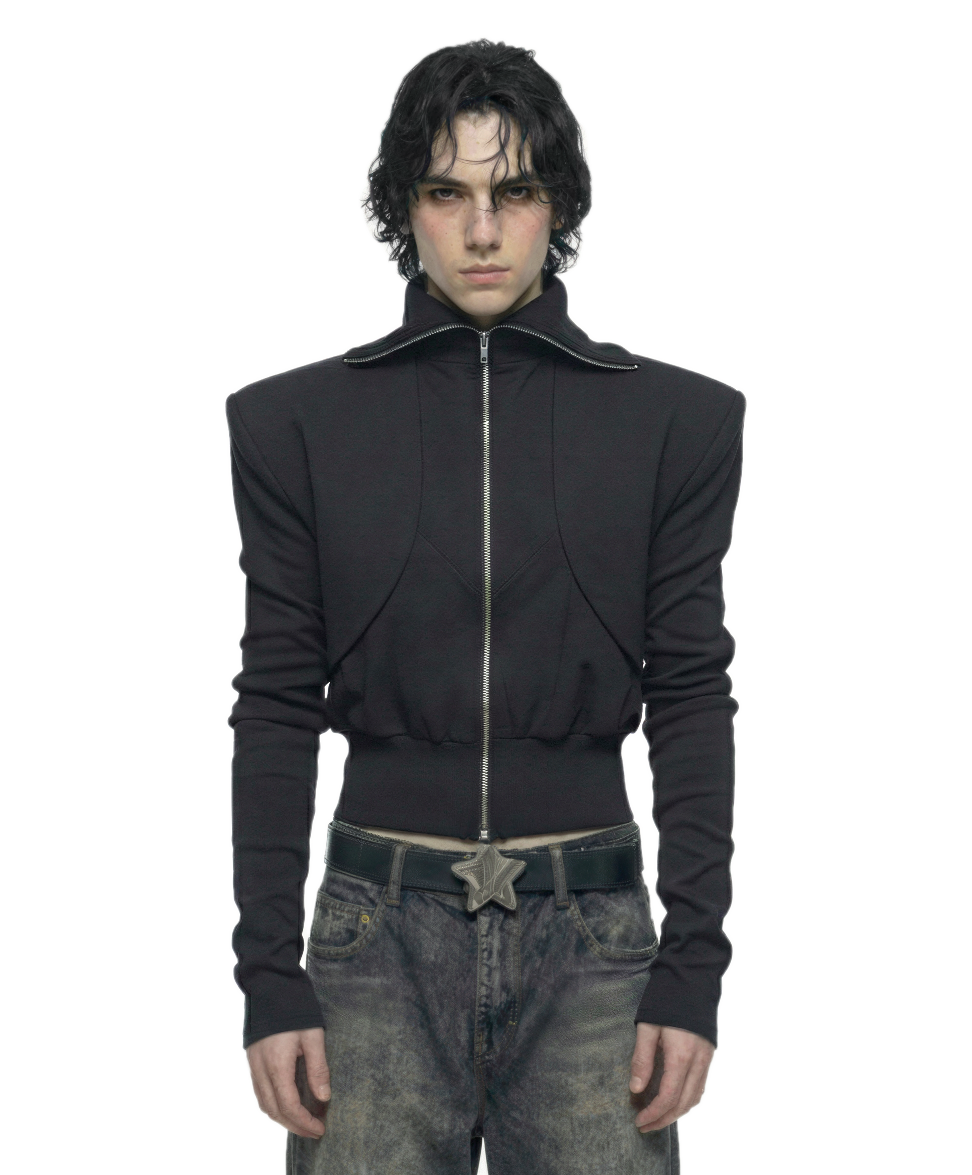 The 'axis' jacket’s defining feature is a sharp, gothic silhouette, created with 4 cm shoulder pads and a 2 mm EVA internal structure. Despite the construction, the jacket feels lightweight — EVA adds shape without adding noticeable weight, so it wears like everyday clothing.